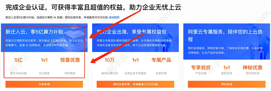 公司迁云上阿里云?阿里云有哪些活动政策补贴?看完这篇文章就知道了,企业用户上云,阿里云有哪些优惠?阿里云推出企业上云第一站优惠活动,企业用户可申请5亿算力补贴、企业出海10万扶持金以及代金券,阿小云整理企业上云第一站优惠活动:域名、云服务器、AI大模型Tokens、云数据库、GPU服务器、阿里云盘企业版都有活动: