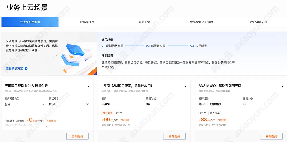 企业上云会涉及云上高可用架构、数据库迁移、网站安全、优化全球访问体验及用户运营分析等使用场景,阿里云针对不同应用场景均提供解决方案以及优惠活动,如下图: