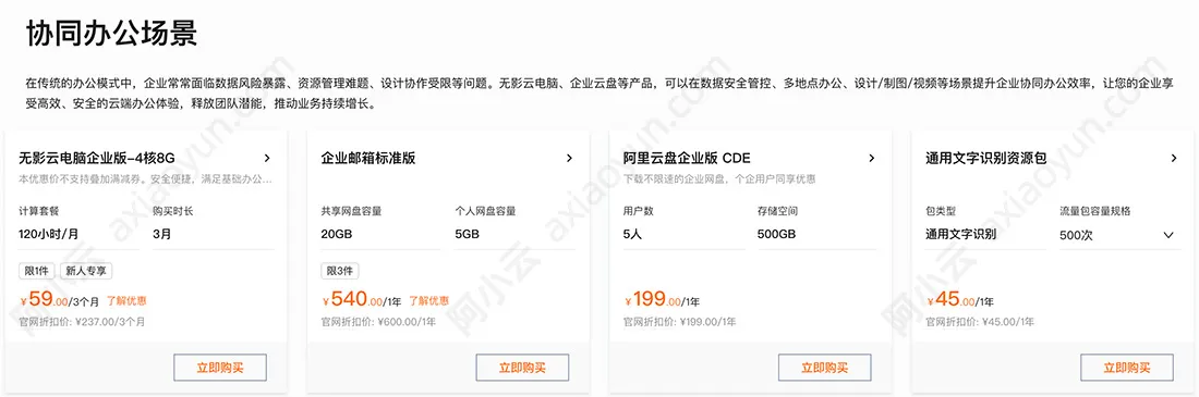 阿里云为企业用户协同办公应用场景提供无影云电脑、企业邮箱、阿里云盘企业版等产品,并且价格优惠,如下图:
