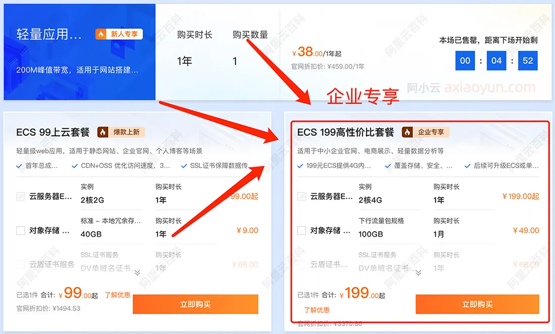 阿里云官方活动主会场:https://www.aliyun.com/activity   企业专享的云服务器优惠199元一年,续费也是199元,配置是ECS通用算力型u1实例ecs.u1-c1m2.large、2核4G配置,自带5M固定带宽、80G系统盘,如下图:
