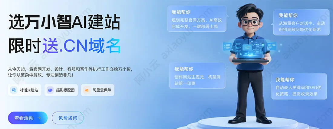 公司想在阿里云搭建网站有多种方式,目前阿里云推出一款AI建站方式:万小智,对话式建站模式,把你对网站的需求通过对话的形式告诉万小智,万小智会轻松为你生成你想要的网站风格,万小智官方活动页面:https://wanwang.aliyun.com/website/xiaozhi  如下图: