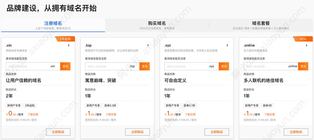 注册xin后缀域名可享受首年0元的活动,但是需要一次性注册2年;top域名注册优惠价格1元首年;xyz域名注册1元首年;.online域名注册价格优惠1元首年。更多域名价格,请移步到阿里云官方页面查看:https://wanwang.aliyun.com/help/price.htm