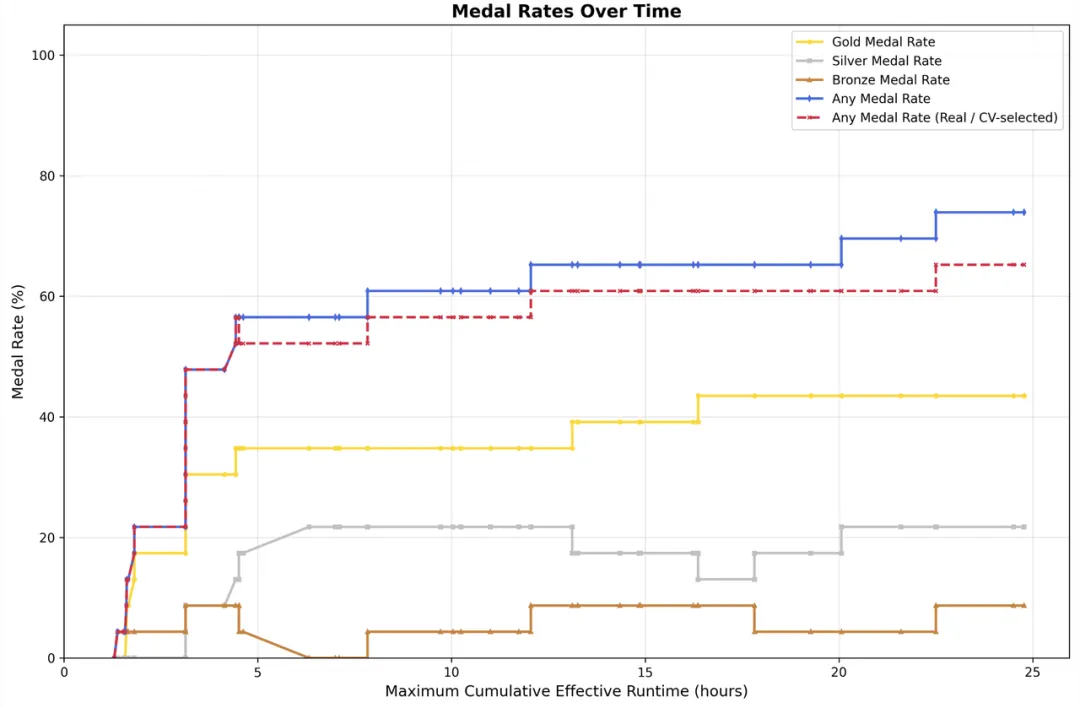 在 MLE Bench Lite 的 22 个机器学习任务测试中,M2.7 三次测试平均得牌率 66.6%,与 Gemini-3.1 持平,仅次于 Opus-4.6(75.7%)和 GPT-5.4(71.2%)。最好的一次取得 9 枚金牌、5 枚银牌、1 枚铜牌。