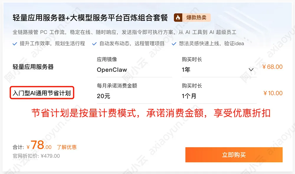 目前阿里云有个OpenClaw部署成本78元套餐活动,包含68元一年的轻量应用服务器和10元的入门型AI通用节省计划,如下图: