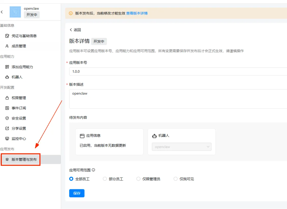 2.机器人信息配置完成后,进入应用的版本管理与发布页面,填写版本号、版本描述,选择应用可用范围,确认信息后点击保存并完成版本发布,版本发布后配置修改才会正式生效。