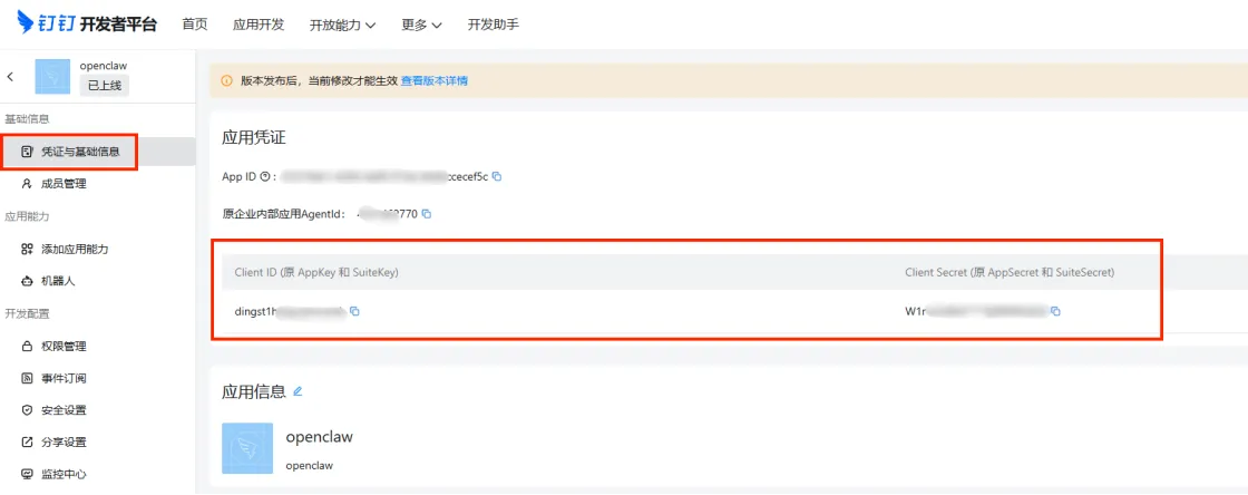 应用版本发布上线后,进入应用的凭证与基础信息页面,准确记录以下两个核心参数,后续用于 OpenClaw 网关与钉钉的对接配置,切勿泄露: