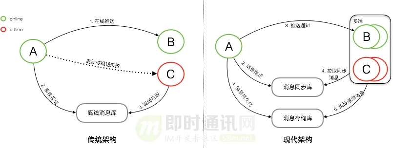 1)消息的同步:将消息完整的、快速的从发送方传递到接收方,就是消息的同步。消息同步系统最重要的衡量指标就是消息传递的实时性、完整性以及能支撑的消息规模。从功能上来说,一般至少要支持在线和离线推送,高级的IM系统还支持“多端同步”;