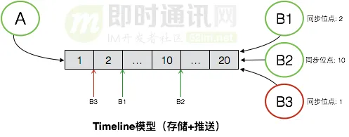 写扩散的消息同步模式,需要有一个额外的Timeline来专门用于消息同步,通常是每个接收端都会拥有一个独立的同步Timeline,用于存放需要向这个接收端同步的所有消息。