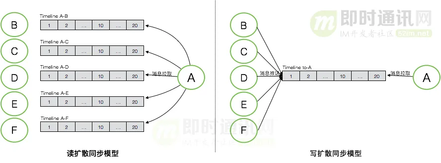 ▲ 读扩散和写扩散两种不同同步模式下对应的不同的Timeline模型