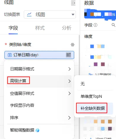 在图表的字段配置区域,找到维度字段 订单日期。点击其右侧的设置图标,在弹出的菜单中选择 高级计算,然后选择 补全缺失数据。此操作将确保所有日期,即使没有对应数据,也会出现在X轴上。