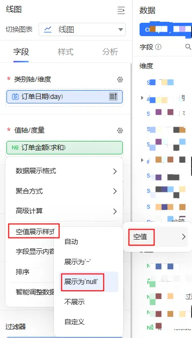 配置度量字段 订单金额 的显示方式。点击 订单金额 字段右侧的设置图标,选择 空值展示样式 选项,并将其设置为 展示为 'null'。确保图表在缺失数据的日期点上明确显示为 null。