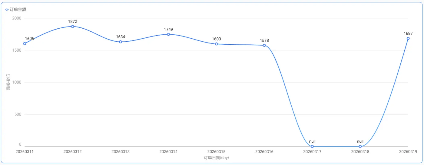 在分析时间序列数据时,如果某些日期没有业务数据(如订单),图表默认会跳过这些日期,导致时间轴不连续。这可能会让报表阅读者误以为是系统数据缺失。