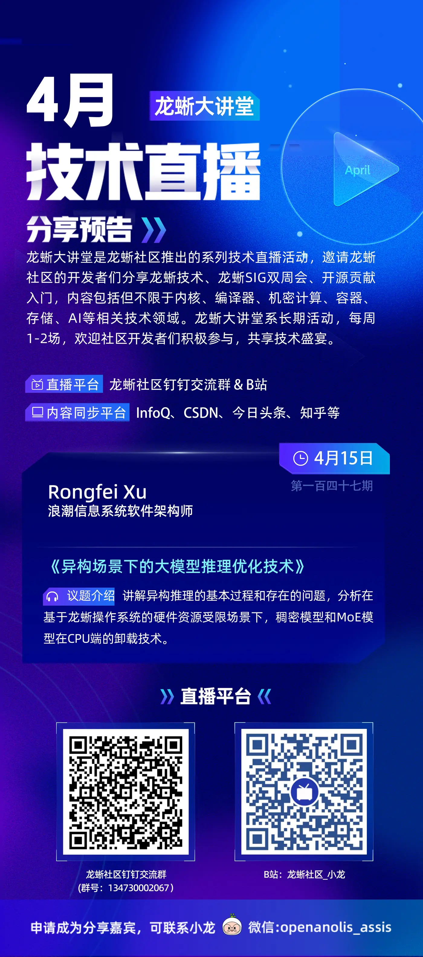 「龙蜥大讲堂」精彩预告来了,点击下方海报抢先了解。欢迎扫描海报二维码提前进群,立即预约锁定这场 AI 关键技术分享!