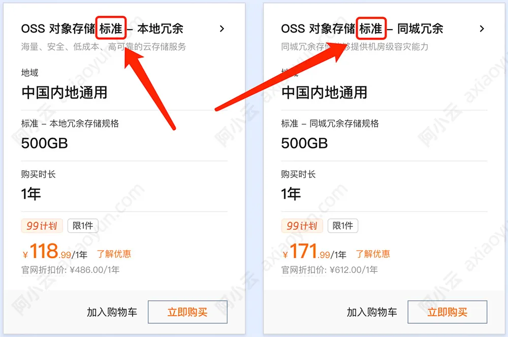 如上图,标准 - 本地冗余存储规格500GB费用118.99元1年,同城冗余存储规格500GB费用是171.99元一年,都是标准存储类型的。