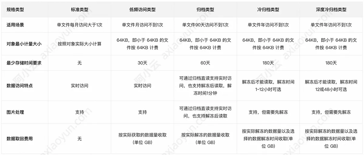 阿里云对象存储OSS存储类型分为标准存储、低频访问、归档存储、冷归档存储和深度冷归档存储,阿小云整理不同存储类型的区别在于适用场景、对象最小计量大小、最少存储时间要求、数据访问特点、图片处理及数据取回费用: