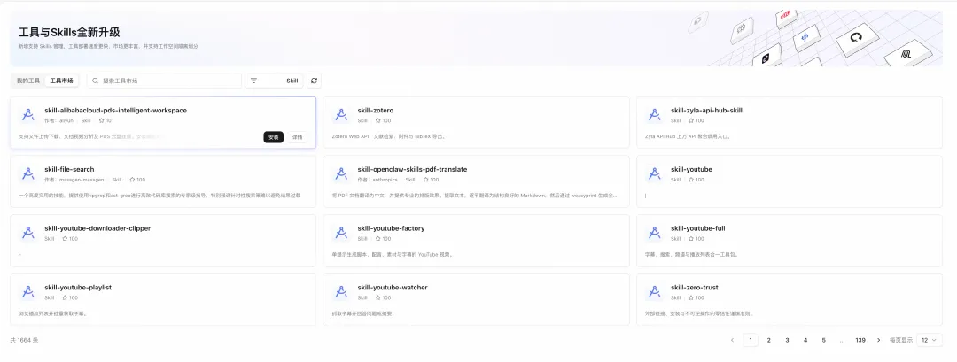 快速创建 Agent,对话发现账号下 Skills,支持快速安装