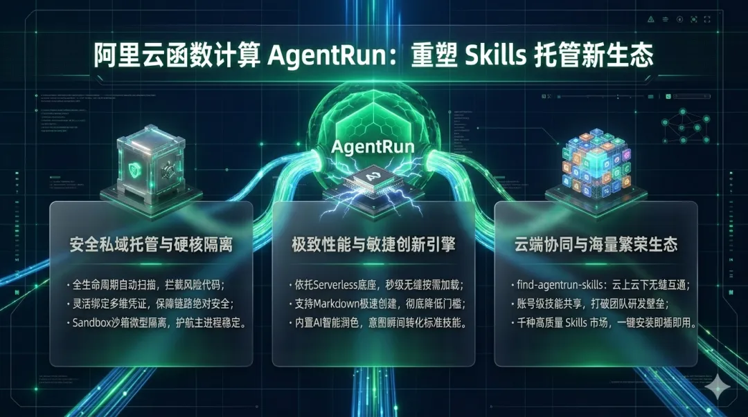 今天,阿里云 AgentRun 发布了一次重要的能力升级——全面支持 Skills 的安全私域托管、沙箱级隔离与秒级加载。从底层的安全防护到上层的千级技能市场,AgentRun 提供了一套完整的企业级 Skill 全链路管理方案,目标很明确:让每一个 Skill 都能在生产环境中安全、高效、规模化地运行起来。