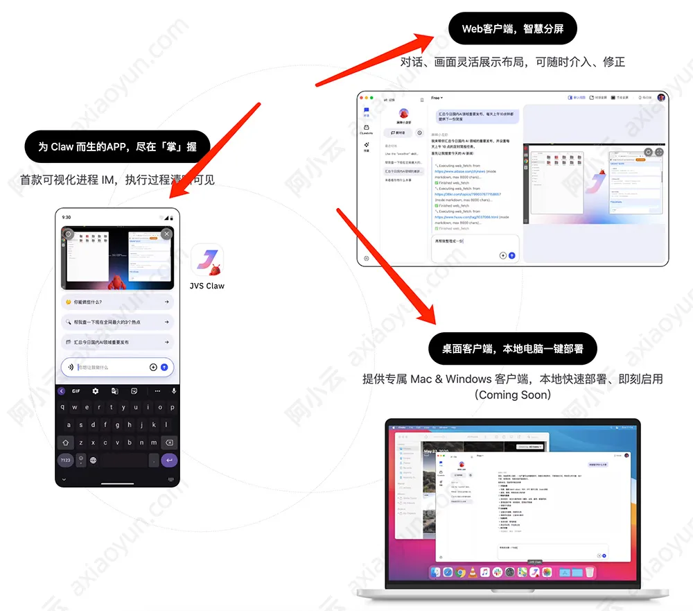 如何快速部署?只需简单三步,你就能在云端唤醒你的OpenClaw,JVS Claw支持多端安装,手机、网页、电脑三端互通,手机端直接去应用商店搜索“JVS Claw”即可下载,电脑端可以直接在JVS Claw官网下载 如下图: