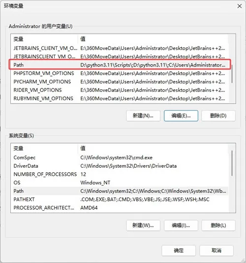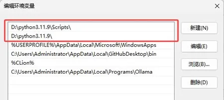 5)点击"新建",手动添加“D:\python3.11.9\” 和 “D:\python3.11.0\Scripts\”,将 Python 安装路径修改成自己的,然后单击确定按钮,就完成了对环境变量的设置。