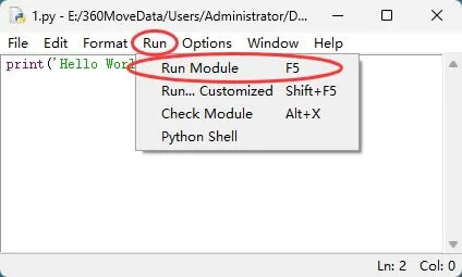 编写完成后,可以按快捷键 <Ctrl+S> 保存文件(会得到一个 .py 文件)。运行它也很简单,在新窗口的菜单里依次选择“Run -> Run Module”: