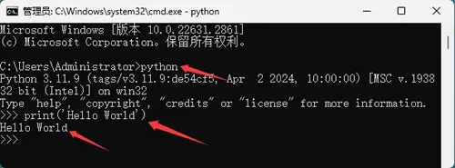 最后可以编写一个输出“Hello World”的 Python 程序,在命令行窗口里输入“python”或“python3”,进入Python交互式环境,然后运行编写和运行Python代码: