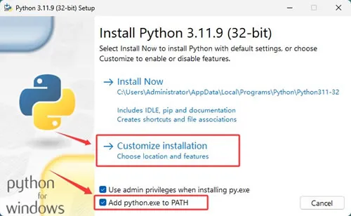 这里一定要勾选"Add Python to PATH",然后点击“Customize installation”。