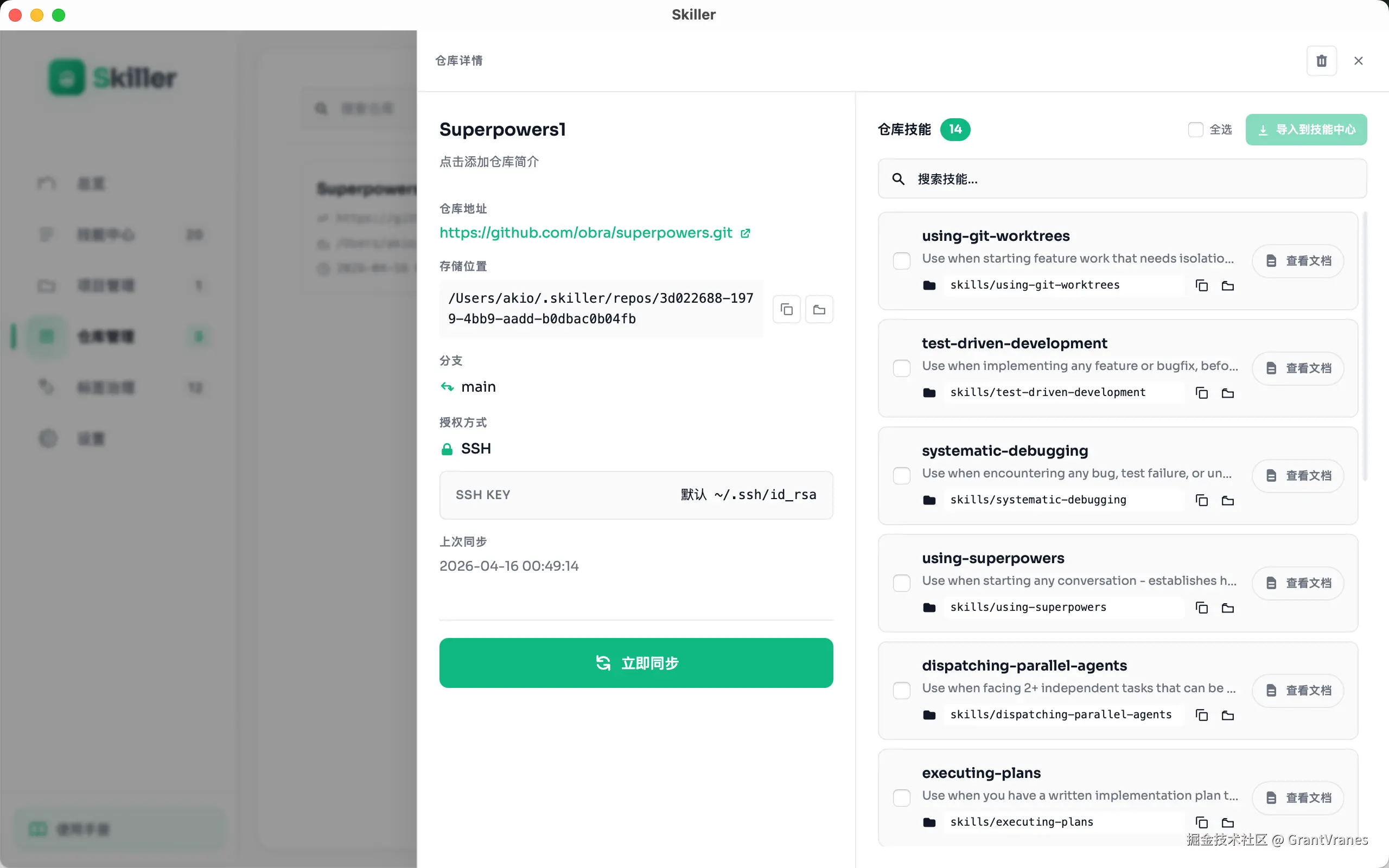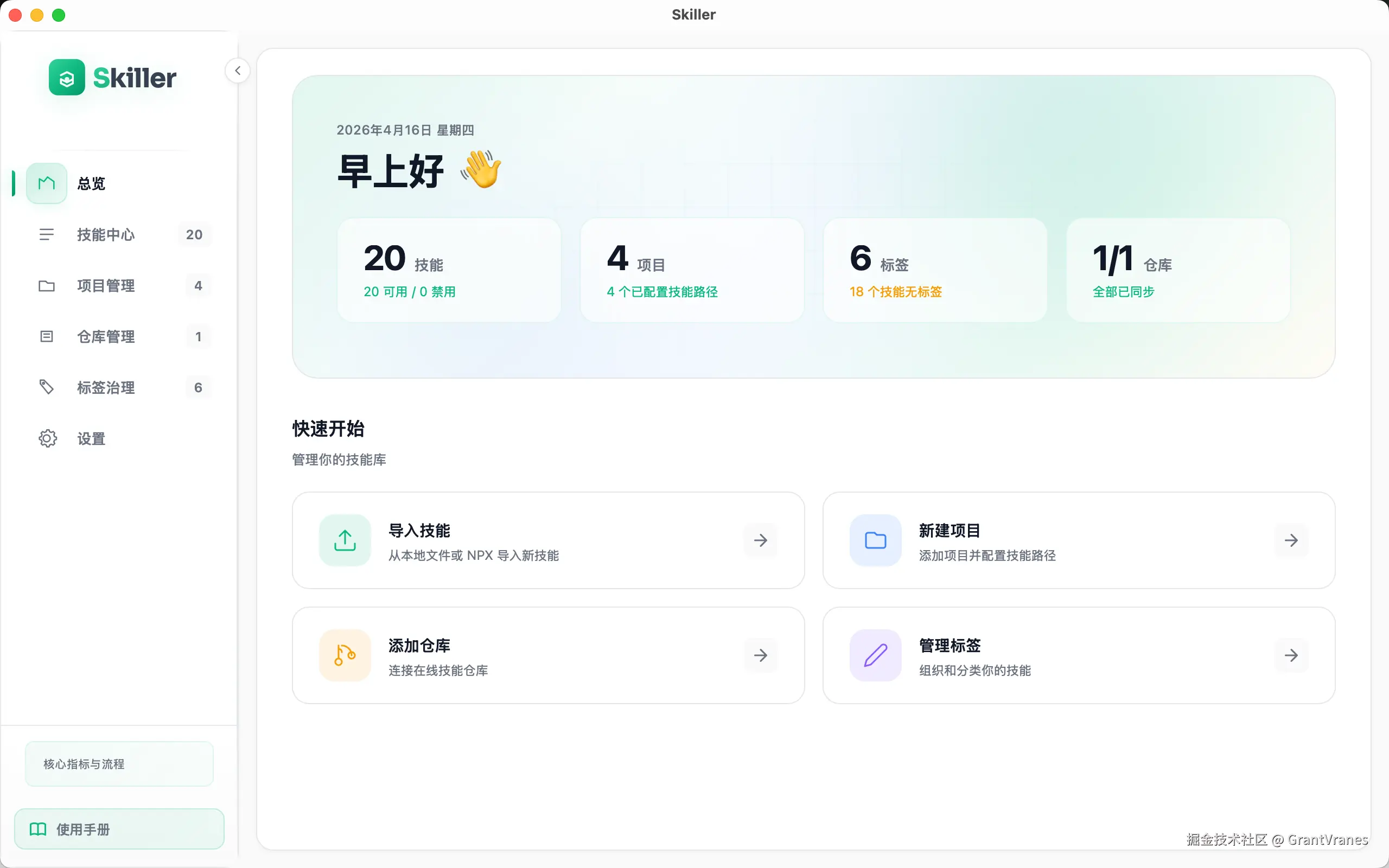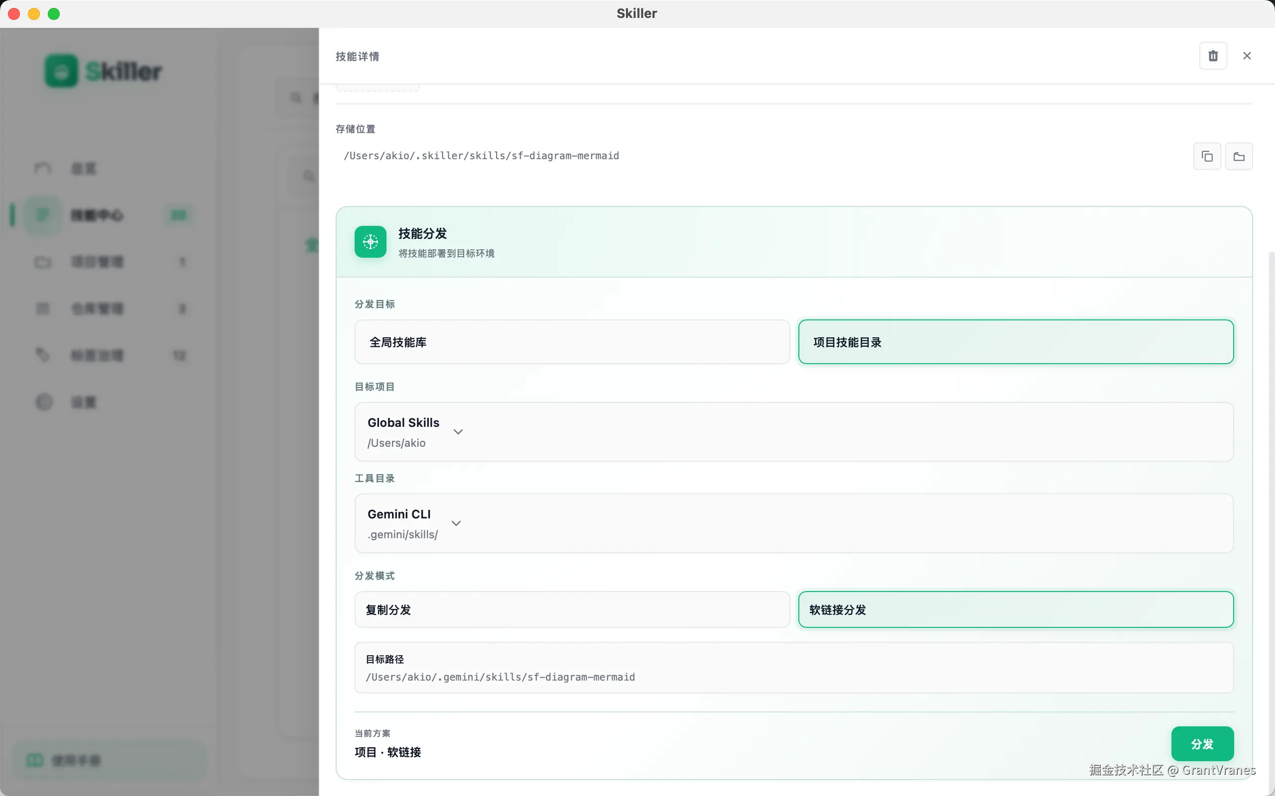 Skiller 的诞生,就是为了解决这些问题。它不是另一个技能仓库,而是一个统一调度中心——你只需要在一个地方管理技能,然后一键分发到所有需要的工具和项目。