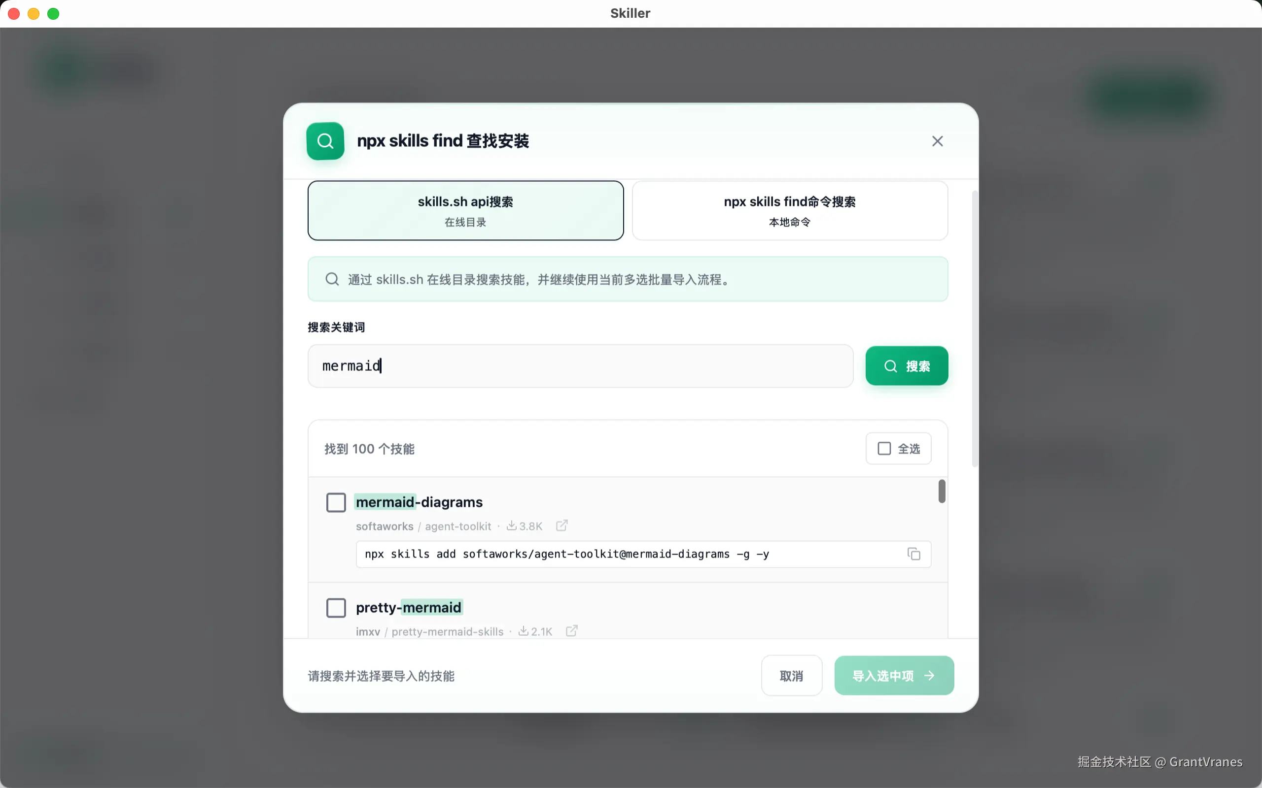 - 导入技能:点击「导入技能」→「从 NPX 查找」→ 搜索并安装