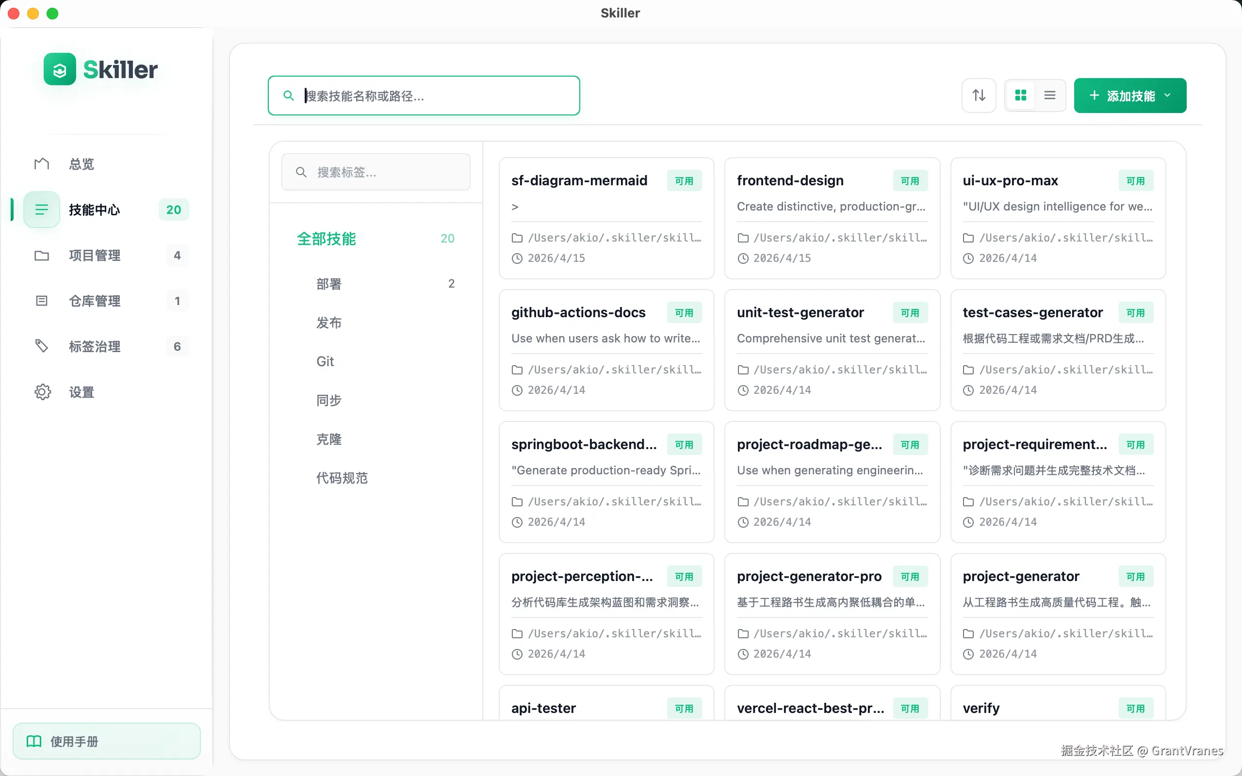 你不再需要记住每个工具的配置路径,也不需要在多个目录之间来回切换。在 Skiller 中,所有技能都在一个地方,一目了然。