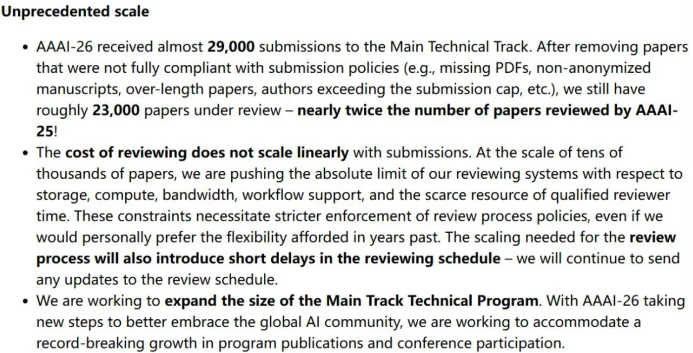 意味着需要更多的审稿人。AAAI-26为此招募了超过28,000名项目委员会成员、高级项目委员会成员和领域主席——几乎是前一年的三倍。意味着每位审稿人被分配了更多论文,审稿周期被压缩,经验不足的审稿人也被拉来“救火”。