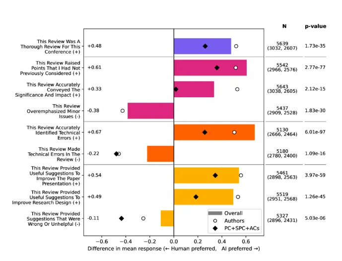 结果出人意料——参与调查的学者们不仅觉得AI审稿有用,而且在多个关键维度上,他们更偏好AI评审而非人类评审。
