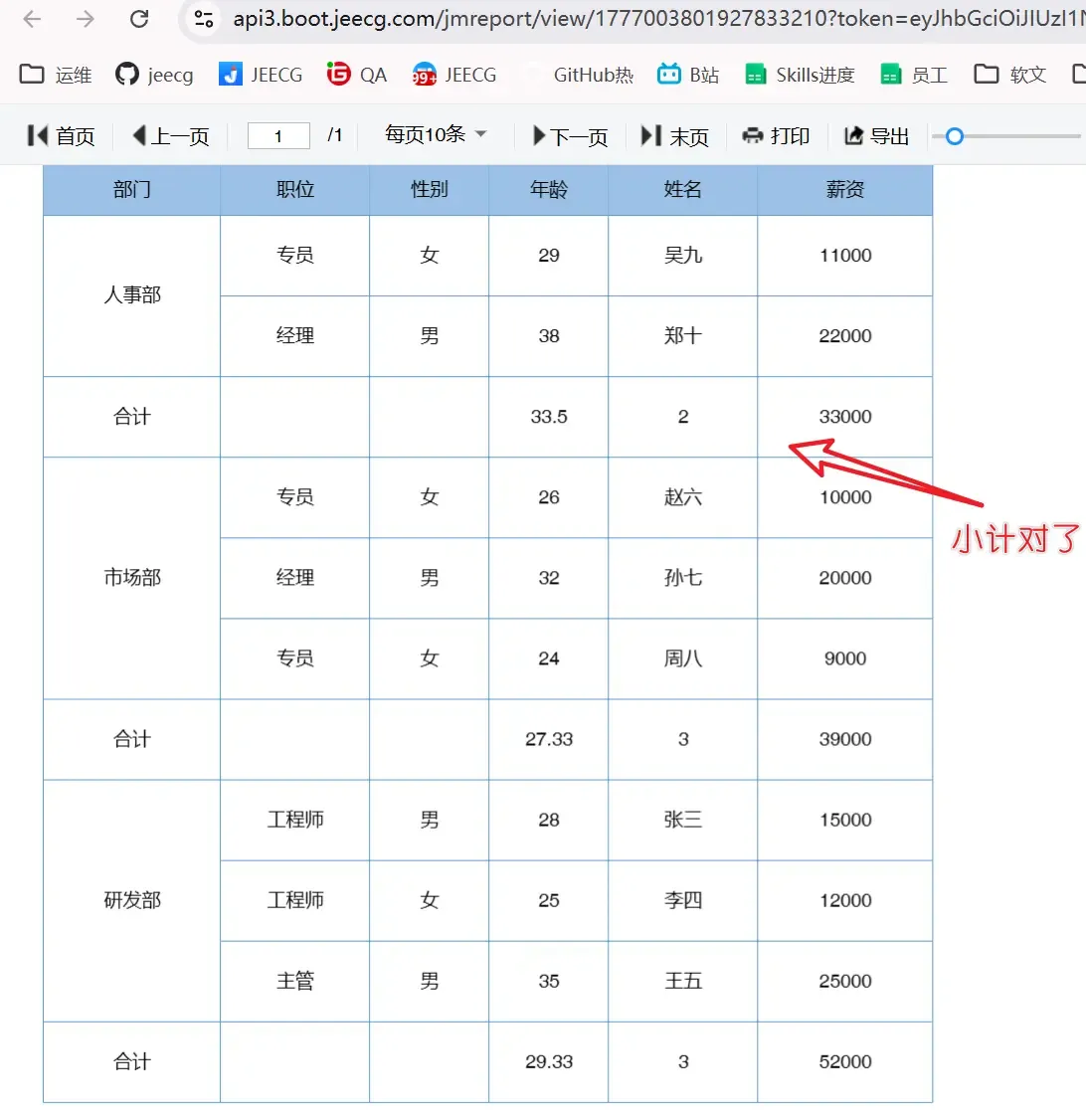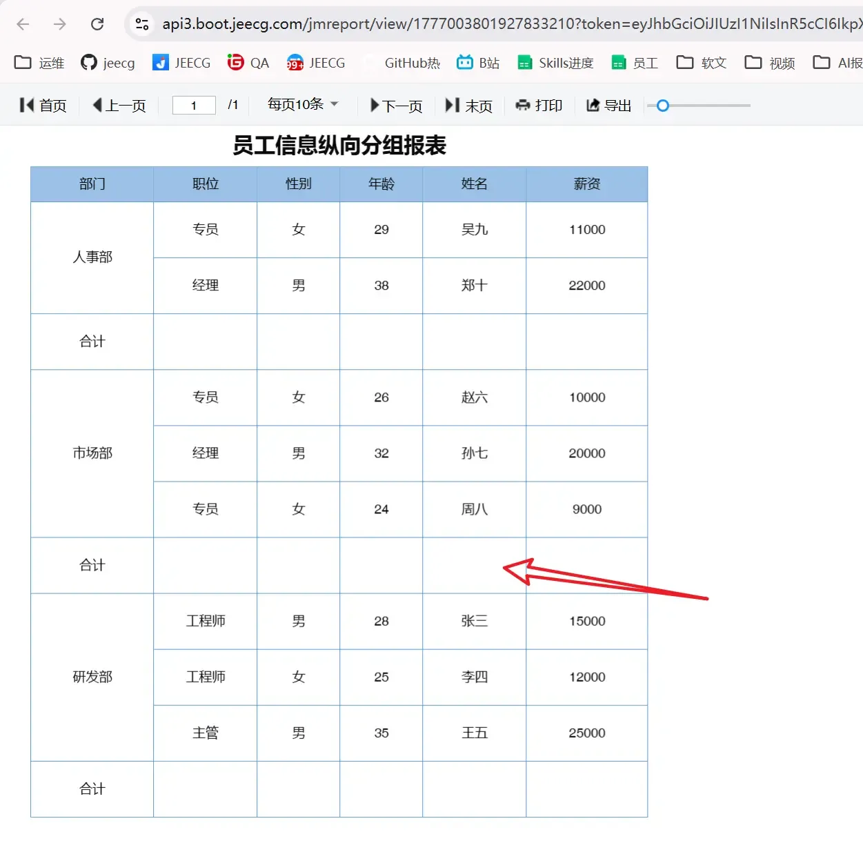 模型第一次生成配置后,报表渲染出来,结构基本正确——按部门(人事部、市场部、研发部)纵向分组,每个部门内的员工明细都显示出来了。但有一个明显问题:合计行完全是空的,年龄、人数、薪资的小计数据一个都没有显示。