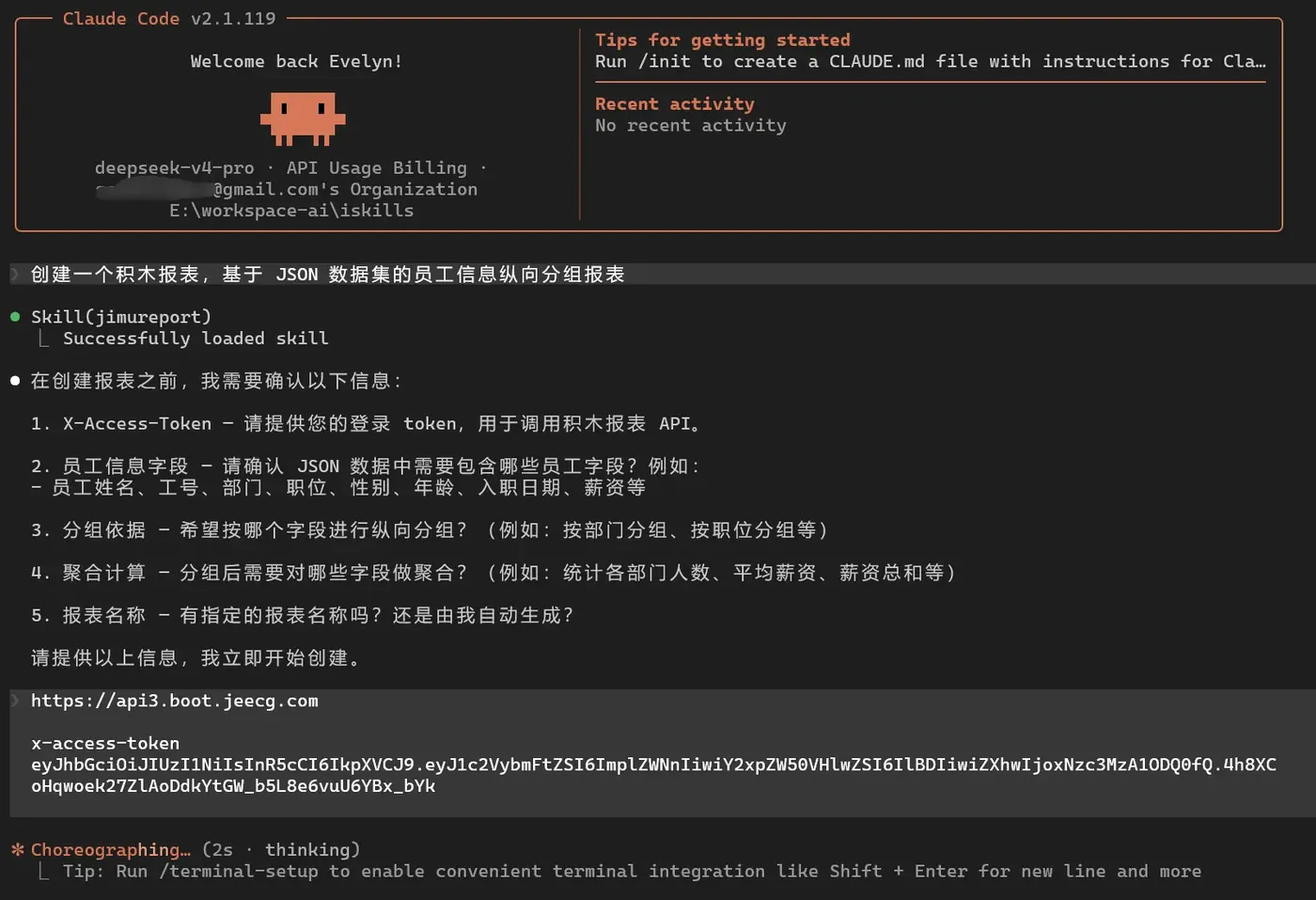 测试目标:让 Claude Code 调用积木报表(JiMu Report)的 AI 建表 Skills,自动创建一张员工信息纵向分组报表,要求按部门分组并显示小计。