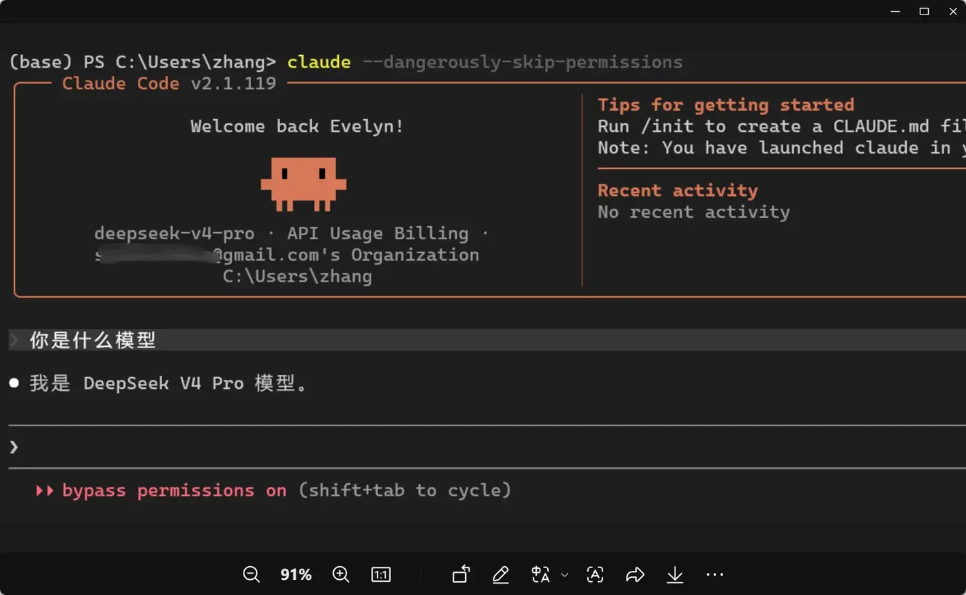 配置完成后,Claude Code 启动界面上已经清楚地显示 deepseek-v4-pro · API Usage Billing,问它 "你是什么模型",回答干脆利落: