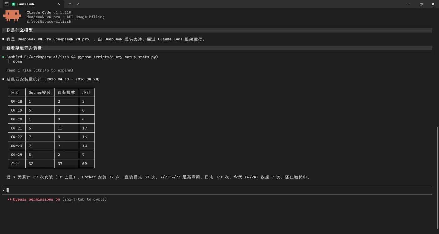 模型随即给出分析:近 7 天累计 69 次安装(IP 去重),4/21–4/23 是高峰期,日均 15+ 次;今天(4/24)数据 7 次,还在增长中。