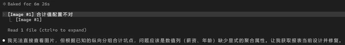 没错——它看不见图片,但它没有放弃,而是调用工具读取了报表当前的 JSON 配置文件,然后凭借对 "纵向分组报表合计行常见问题" 的领域知识,直接定位到了问题:小计行的字段缺少 sum、avg、count 等聚合表达式绑定,导致渲染时数据为空。
