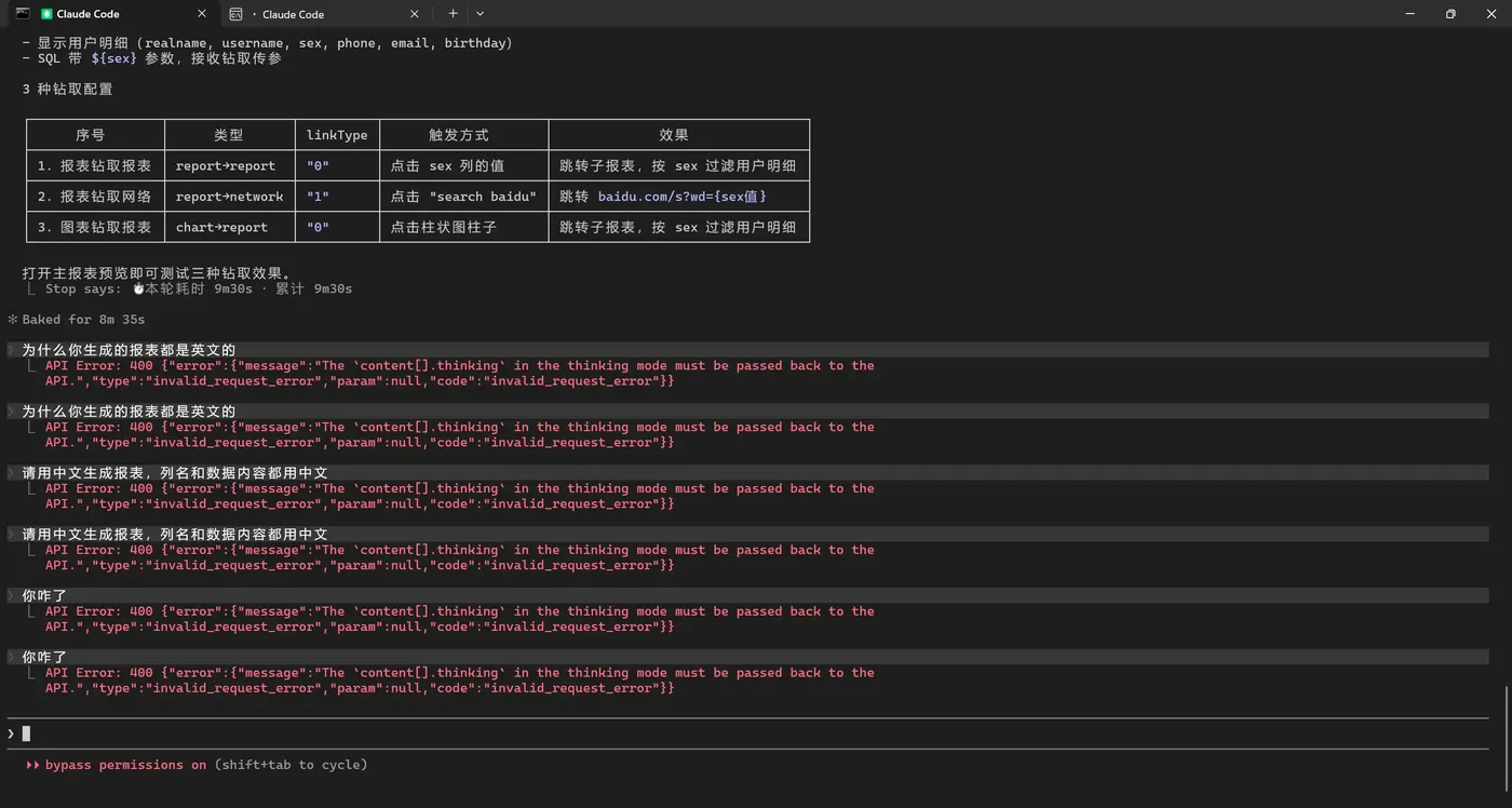 但话说回来——回头看前面测试二和测试三,大屏问题和报表样式问题都是在"看不见图"的情况下修好的。它通过读配置文件、凭领域知识推断,绕过了图像这个盲区。这恰恰是最能体现能力的地方。
