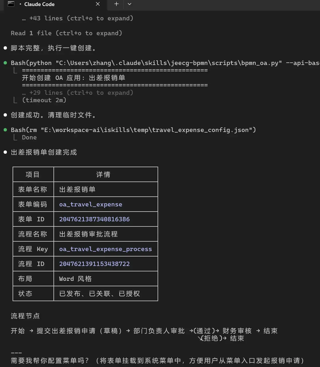 指令下达后,模型快速调用了 JeecgBoot 的 BPM 流程设计 Skills,自动生成了审批流程图和对应的配置。