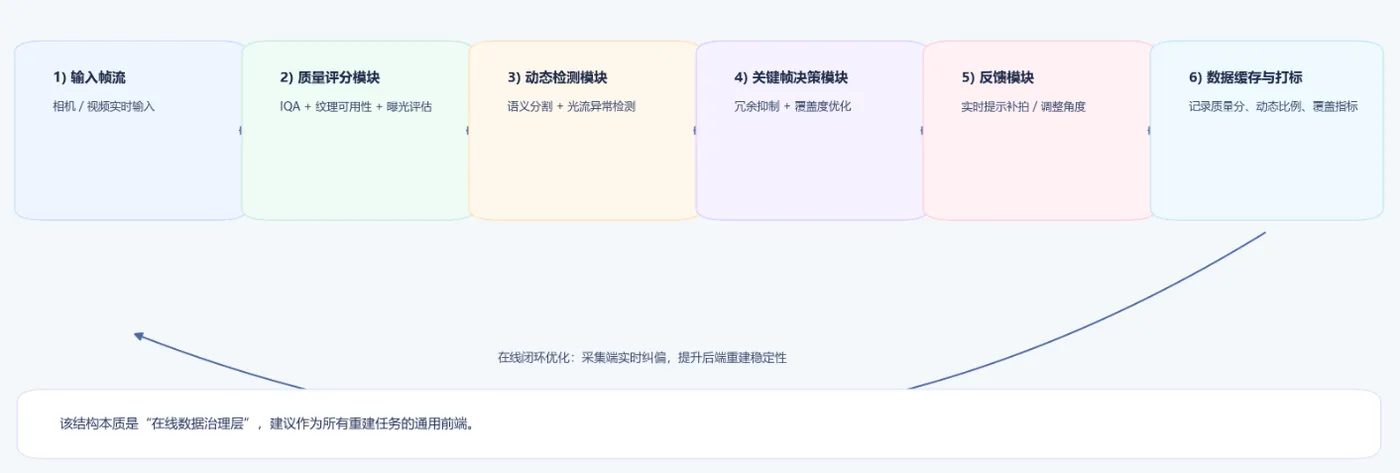2) 采集中筛选:质量评估、关键帧选择、异常检测与自动回采。