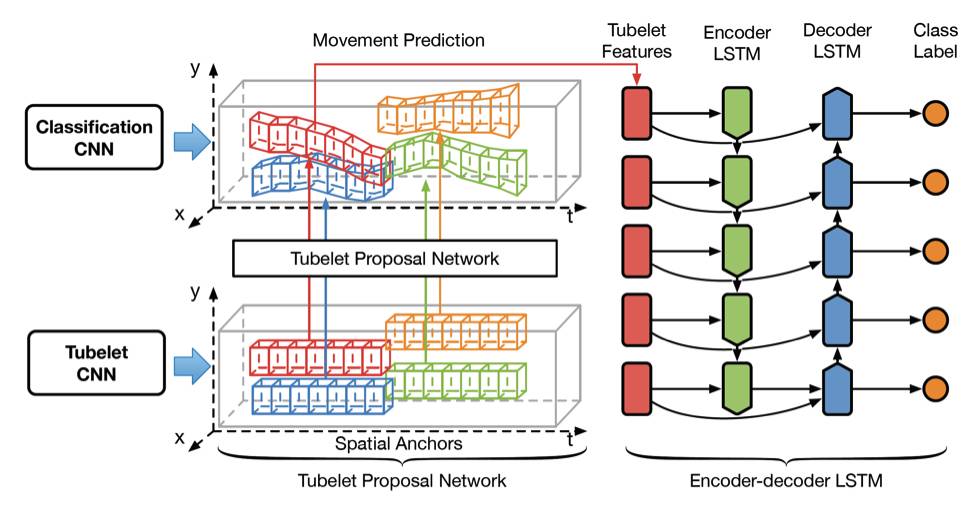 视频中的物体检测问题由于其在高级AI系统如自动驾驶、家居机器人中的潜在用途近年来获得了广泛的关注。相较于传统静止图片的物体检测问题现有的视频物体检测方法通常基于时空“管道”(tubelets)即跨时间连接的检测框来有效的应用视频中的时域信息。但是现有方法中时空管道生成的质量和效率往往差强人意基于运动信息的生成方法只能生成较短的时空管道而基于图像信息的生成方法需要花费大量的计算量也不能保证对于物体较高的召回率。该论文[5]将传统针对静止图像的FasterRCNN框架进行了扩展将视频物体检测框架扩展为“候选时空管道生成”和“候选时空管道识别”两个模块提出了一种高效率的候选时空管道生成方法能够在保证时空管道较长长度的同时尽可能的保留不同时空管道的多样性从而提高物体的召回率。基于这些高质量的候选时空管道应用编码-解码LSTM网络进行时空管道的识别能够有效的提升检测整体的正确率。作者还对TubeletProposal Network初始化和不同设置进行了详尽分析基于TPN的物体检测平均正确率相较于静止图像检测框架有>5%的提升。