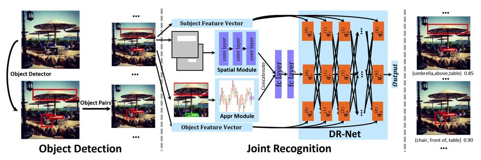 物体检测与识别一直是计算机视觉研究的重要方向。近年来随着Faster RCNN等基于深度学习的检测框架的发展物体检测的性能有了长足的进步但这对于图像理解仍然是不足够的。出现了同类型物体的图片它们背后传递的含义可能是截然不同的。要理解这样的图片我们不仅需要判断图中出现的物体的类型而且需要理解物体之间的关系。最近一段时间关系识别逐步进入计算机视觉研究的视野。在这个问题上的一个有代表性的工作是斯坦福大学李飞飞团队在2016年10月发表在ECCV上的论文。该工作把语言先验用于关系识别相比于之前的方法取得了不错的进展关系识别的准确率提高到了48%。然而这样的准确率显然离满足实用需求仍有较大的距离同时它也反映的问题的难度。这个问题的主要挑战在于关系与物体有着显著不同的性质。某种类型的物体它的外观表现往往比较一致而同一种关系的外观表现往往千差万别。此论文[12]提出了一种新的建模方法把统计学习和深度网络有机地结合起来。此方法把一个基于条件随机场(ConditionalRandom Field)的迭代推断方法解开从而把它表达为一个前向计算网络。这个前向网络和CRF一样具有统计推断的能力但是它可以被嵌入到一个更大的深度学习系统中和其它模块一起进行端对端的学习。基于这种方法此论文提出了一个称为DeepRelational Net的关系理解框架把特征学习以及跨领域关系学习结合成一个统一网络。这个框架在关系理解领域的主要数据集Visual Genome上把关系识别准确率从48%大幅度提高到82%从而为这个问题设立了新的性能标杆。这篇论文在CVPR 2017被接收为Oralpresentation。该论文相关代码与模型结构已经在Github公开https://github.com/doubledaibo/drnet。