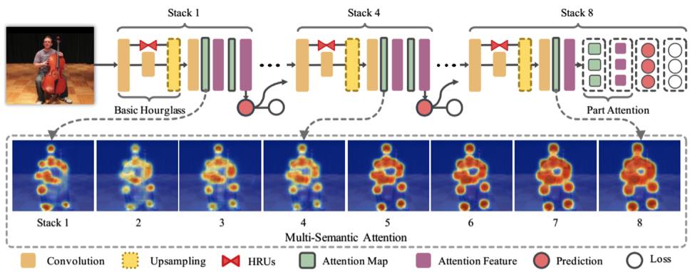 此论文[1]提出的多情境注意力机制网络multi-context attention network首次将注意力机制模型与人体姿态估计任务有效结合通过设计三种不同的注意力机制模型——多尺度注意力机制multi-resolutionattention多语义注意力机制multi-semantics attention人体全局-局部注意力机制hierarchicalglobal-part attention——来学习图像上下文信息能够有效去除人体姿态估计任务里的冗余背景提高对易混淆人体部位分辨能力从而人体关键部位的检测精度。在最广泛使用的单人体姿态识别数据集MPII上该方法准确度在已发表的工作中最高。该方法目前已经开源代码可在如下网站获得https://github.com/bearpaw/pose-attention