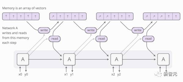 这里A被称作 controller(图中是在处理序列数据,有个错误,最后应该是x3,y3), 可以是FNNs(feedforward neural networks),也可以是RNNs,但RNNs能实现更多操作,因为它是 Turing Complete 的。