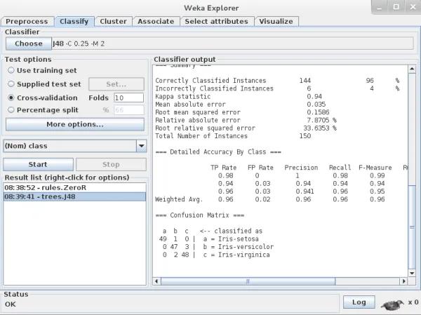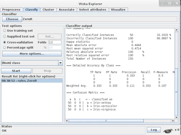 ZeroR算法选择数据集中的主要种类(鸢尾花的三种特性在数据中等比例呈现,所以它得出的结果是第一种:setosa)并以此完成所有的预测。这是衡量其它算法正确性的基准。正如我们所期望的,结果是33%(共三种类别,每种有相同的可能性,相当于三分之一,每次预测有33%的分类准确度)。