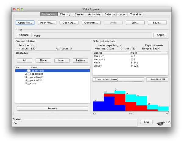 这个界面中,你可以加载数据集,运行分类算法。也提供了数据过滤、聚类、关联规则提取和可视化等特性,但我们并不会现在就使用这些特性。
