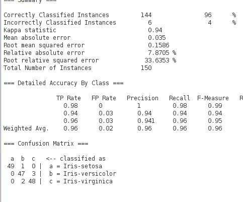 然后看“Confusion Matrix”,你可以看到真实的分类结果的表格。其中1个错误,把Iris-vsetosa分类到了Iris-versicolor,2个把Iris-virginica分类到Iris-versicolor还有3个Iris-versicolor被分类到Iris-setosa(一共6个错误)。这个表格可以帮助解释算法的准确度。