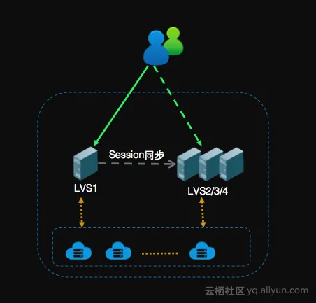 SLB集群是通过Session同步来实现集群中有机器故障时尽可能不影响用户请求的。如下图所示,当用户的访问请求经过集群中的一台LVS时,集群会根据预设的规则将Session同步到其它LVS机器,从而实现LVS集群所有机器都有该Session,当如下图中的LVS1机器出现故障或需要维护时,用户请求就会通过其它LVS机器进行流量转发并且用户基本不感知。但是有Session同步不代表就解决了所有问题,Session同步能解决大部分长连接的问题,但是对于短链接,连接未建立(三次握手未完成)或者已建立连接但是还没有触发Session同步规则时,机器故障还是可能会影响用户请求。因此,需要用户的系统和程序进行配合。