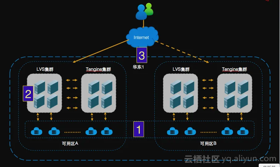 上面说的是在一个可用区内负载均衡转发集群的高可用,跨可用容灾层则要解决的是当一个可用区都不可用时,还能继续使用另外一个可用区的负载均衡继续提供服务。