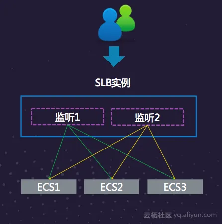 下图是负载均衡的简单示意图,用户的访问请求经过SLB实例的一个监听(端口),再被转发到后端的ECS上。SLB实例对应一个IP地址,监听就是实例上IP地址的一个端口,流量调度是基于监听(端口)进行的,ECS是真正处理服务请求的。