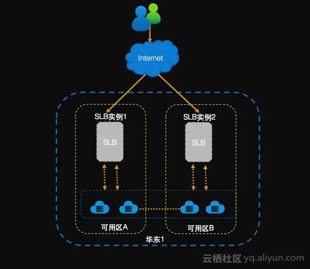 首先,跨可用区容灾需要保证一个SLB实例的后端服务器ECS分布在多个可用区,即避免一个可用区不可用时,SLB后端的ECS都无法使用从而影响用户访问,这点在第一层 应用处理层中已经说明了。当然,如果还使用DB等产品,还需要考虑DB的跨可用区容灾问题,用户可以参考DB相关产品的说明。这里主要谈负载均衡本身以及和负载均衡紧密相关的后端服务器ECS的高可用问题。